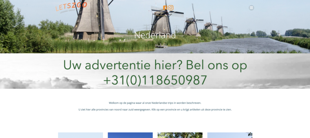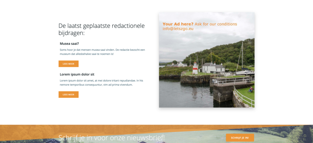 On the Letszgotrips.eu site there are various possibilities to advertise: through banners or through an advertorial. In addition, we will send a newsletter four times a year, which also offers the possibility to advertise. The costs are on request, on this page we will gladly show you the options.